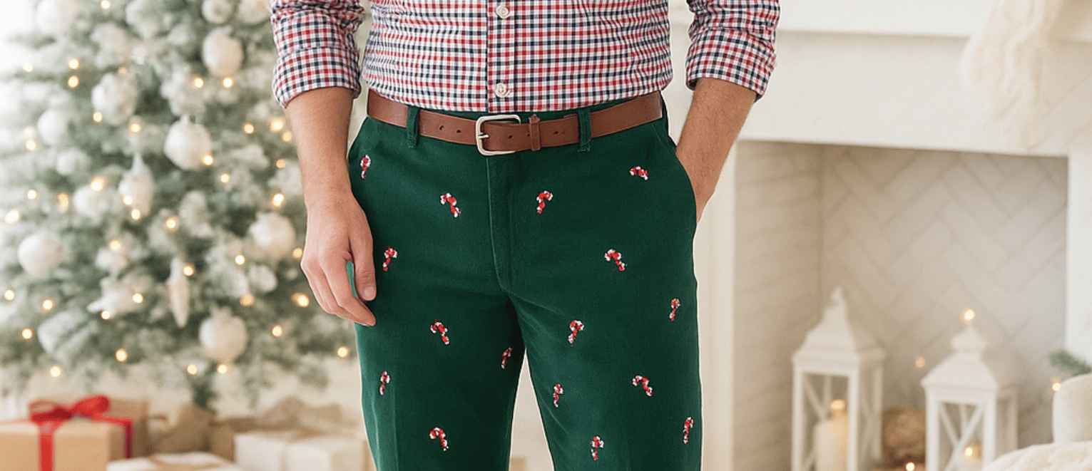 The gold standard comes from Castaway Clothing, whose Christmas embroidered corduroy pants ($175) are made from 14-wale corduroy with just enough stretch to survive a big meal. The motifs range from tasteful (holly berry) to delightfully absurd (Rudolph the Red-Nosed Reindeer covering both legs).